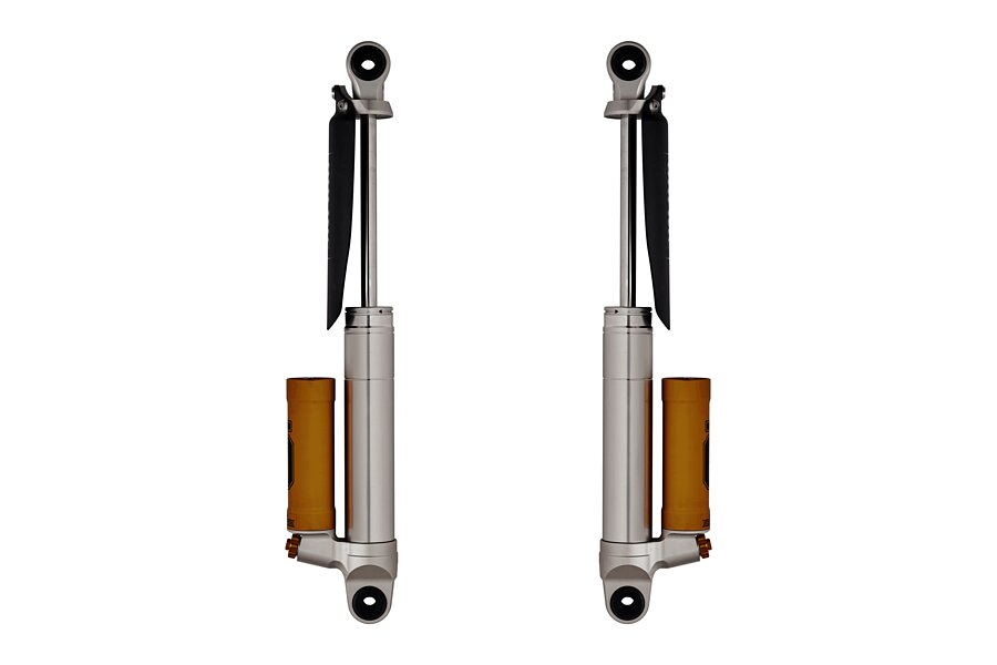 FRONT FEATURES Conventional shock absorber with braided hose for remote reservoir Separate adjustment for compression and rebound damping Uniball top mounts Different spring options